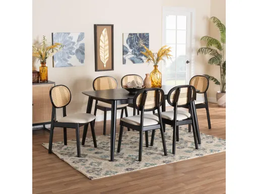 Accumulate an air of traditional elegance in your space with the Darrion dining set. Made in Malaysia, this mid-century inspired set includes six chairs and one table crafted from sturdy wood. Each seat is padded with plush foam and upholstered in soft fabric for a lavish embrace while the round backrests embellished with woven natural rattan create an alluringly cozy display. The Darrion requires assembly and features a rectangular tabletop with rounded corners to provide ample space for each member of the table. Carrying robust personality, the Darrion dining set transforms the feel of any occasion.
