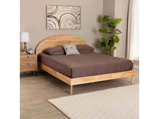 A tranquil composure fills your bedroom with the effortless charm of the Denton platform bed. Made in Malaysia, this Japandi piece is crafted from sturdy wood. Its round headboard creates a beautiful backdrop with rich geometry while offering superb support as you sit and relax in bed. The Denton requires assembly and utilizes wood slats for mattress for mattress support, eliminating the need for a box spring. Rounded legs balance the diverse geometry, making the Denton platform bed a wonderful centerpiece of any bedroom environment.