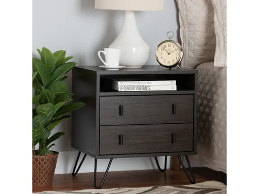 Bring modern convenience to your bedside with the handy Glover nightstand. Made in Malaysia, the Glover is constructed from sturdy wood showcasing a rich dark brown finish. Two wide drawers provide concealed storage, while an open shelf and rectangular tabletop allow for easy organization of bedside essentials and decorations. Requiring assembly, the Glover is fitted with rose goldtone metal legs for excellent stability and a cool, modern look. Long rectangular black drawer handles add minimalist charm, making the Glover nightstand a chic addition to any space.