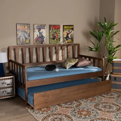 Midday naps and cozy reading marathons are made easy with the Midori daybed. Made in Malaysia, the Midori combines the functions of a sofa and bed into one. Its sturdy wood construction ensures durability, while its classic walnut brown finish adds warmth any space. Tapered, slatted panels give the Midori a cool, contemporary look and convey a light, airy feel. This versatile piece is also fitted with a roll-out trundle to provide convenient accommodation for overnight guests. Requiring assembly, the Midori daybed is the quintessential piece for a child's room or guestroom.