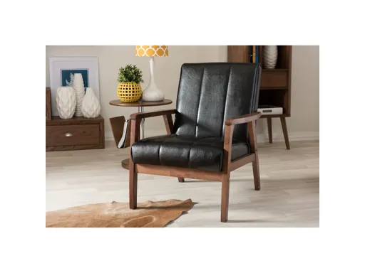 The Nikko is a stunning lounge chair perfect for modern lounges and receptions. It incorporates the elements of simplicity, style and comfort, wrapping it all into a new and clean silhouette. Made from solid rubberwood, it is purposefully designed for compact everyday use. Upholstered in black faux leather and padded with foam, the Nikko is ideal for the conservatory, kitchen or your living room. Angular wood frame gives a nod to mid-century style, combining Scandinavian design with lux colonial wood in cocoa finishing and complementing the black-toned upholstery for a moody palette steeped in classic masculinity.