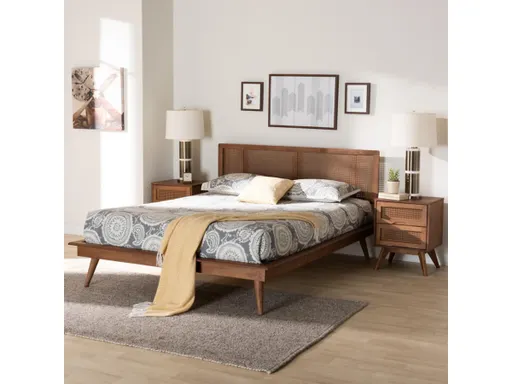 Craft a personal oasis of classic elegance in your bedroom with the fantastic Nura bedroom set. Made in Malaysia, this mid-century set includes one bed and two nightstands crafted from sturdy wood. Each nightstand is equipped with two drawers to organize a variety of bedroom essentials while reserving the tabletops for nightly use. The Nura requires assembly and features wood slats for mattress support, eliminating the need for a box spring. Woven rattan embellishments lend traditional vigor, making the Nura bedroom set a remarkable arrangement for any bedroom.