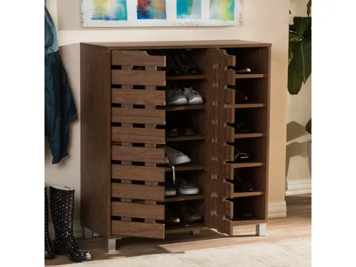 Featuring modern and contemporary design, this fantastic 2-door shoe cabinet with open shelves combines storage with style. The shoe cabinet is complemented by two of its slatted doors for a sleek appearance. Constructed of engineered wood, the shoe cabinet is finished with "walnut" medium brown faux wood grain veneer for practical everyday use. The two pulled out doors reveal six storage shelving space inside and can hold up to 18 pairs of shoes. The open shelves on the right add extra shelving space for another six pairs of shoes. To add chic style, five vinyl feet are added to provide floor clearance. Suitable for your bedroom, living room or entryway area, the Shirley provides modern storage solution for your shoes.