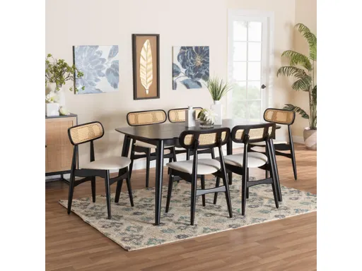 Compose an arrangement of traditional refinement in your space with the charming Tarana dining set. Made in Malaysia, this mid-century inspired set includes six chairs and one table crafted from sturdy wood. Each seat is padded with plush foam and upholstered in soft fabric while the rectangular backrests are meticulously woven with natural rattan for a remarkably soothing display. The Tarana requires assembly and features a broad, rectangular tabletop with rounded corners to offer ample room for each member of the table. Evoking classic elegance, the Tarana dining set adds robust character to any occasion.