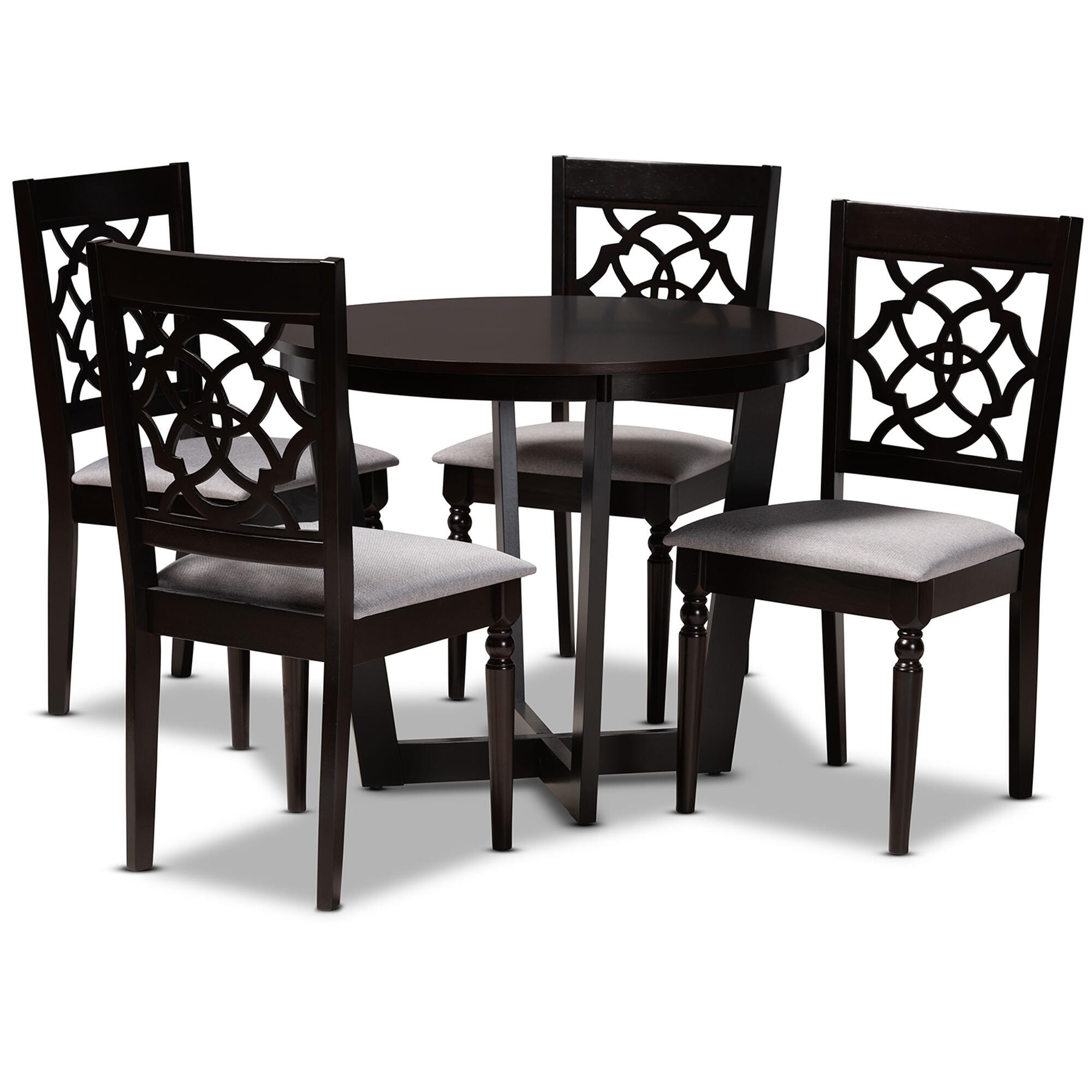 Contemporary style meets modern comfort with the Valerie dining set. Made in Malaysia, the Valerie includes four chairs and one table constructed from sturdy wood finished in a rich dark brown. Each chair features a unique cut-out design on its back and is fitted with a foam-padded cushion upholstered in smooth gray fabric. Requiring assembly, the circular tabletop allows ample elbow room for each member of the table. Perfect for both casual and formal occasions, the Valerie dining set easily elevates any dining experience.