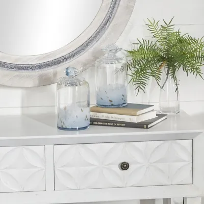The perfect compact storage for your belongings while keeping your surface space protected. Give your surface space a finishing touch with these beautifully crafted decorative jars. Elevate your modern living room with this shell set of 2 decorative containers, best showcased against a solid-colored backdrop, making them the perfect centerpiece for mantles or console tables. This item ships in 1 carton. Please note that this item is for decorative purposes only and is not food safe. Glass decorative jars make a great gift for any occasion. Due to the handmade nature of this item, no two will be alike, there will be slight differences in shape, size, and color. Suitable for indoor use only. This item ships fully assembled in one piece. This blue colored glass decorative containers comes as a set of 2. Contemporary style. Vases have 2.90 in, and 2.90 in mouth openings.
