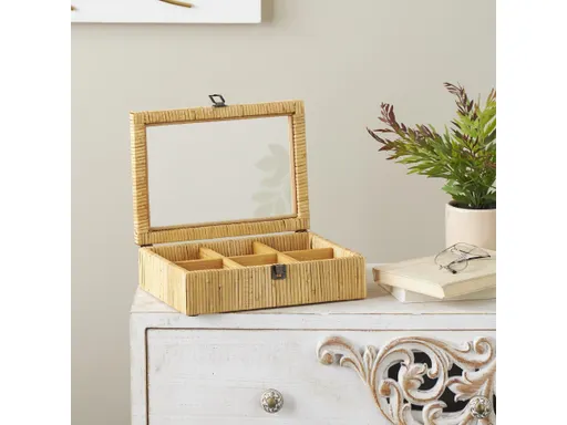 This elegant brown jewelry organizer can be used to store and organize your favorite pieces of jewelry while also serving as an attractive decorative piece on your dressing table or vanity. This item ships in 1 carton. Rattan jewelry box makes a great gift for any occasion. Due to the handmade nature of this item, no two will be alike, there will be slight differences in shape, size, and color. Suitable for indoor use only. This item ships fully assembled in one piece. Maximum weight limit is 10 lbs. This is a single brown colored jewelry organizer. Farmhouse style.