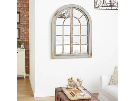 Perfect as an accent piece, the gray entryway mirror can be placed in various spaces including the living room, hallway, or bedroom. This item ships in 1 carton. Can be hung vertically using the d-rings; nails and screws not included. Suitable for indoor use only. This item ships fully assembled in one piece. This is a single gray colored entryway mirror. Farmhouse style.