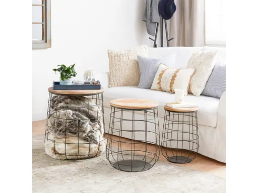 This 3-piece wire basket with lid set features an industrial-farmhouse design that sits well next to brown wood or gray fabric furniture. Keep your belonging organized in these metal baskets with wood lid that securely closed with a hook latch. Filled with shoes, books, blankets and more, these storage baskets are a stylish way to store your stuff. This item comes shipped in one carton. Suitable for indoor use only. Set of 3 metal mesh baskets with wood lids. Farmhouse-themed style.