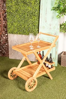 A versatile piece ideal for storage or decorative display in any space. Looks stylish in your living room or kitchen as a serving tray or as a decor stand. Decorate this teak wood bar cart with wheels in your patio for additional storage or as plantstand for a creative display. This item ships in 1 carton. Suitable for indoor and outdoor use. This item ships fully assembled in one piece. Due to the live edges of the piece, each is unique, so no two products will have an identical pattern, shade, or cut. Maximum weight limit is 40 lbs. Made in Indonesia. This is a single brown colored serving cart. Teak bar cart features 2 shelves. Traditional style. Teak wood naturally retains its oil, making it water-resistant and durable for long term use. We recommend to use clear teak oil with strong UV protection to ensure longevity. Brown bar cart can hold 3 average wine bottles.