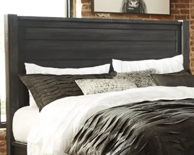 The Baylow king panel headboard is dressed to impress with a unique twist on casually elegant farmhouse interiors. Its square, “stocky” styling is richly enhanced with plank effect details and a distressed vintage black finish that’s not too light and not too heavy. Heavy saw marks add an interesting, craftsman touch.