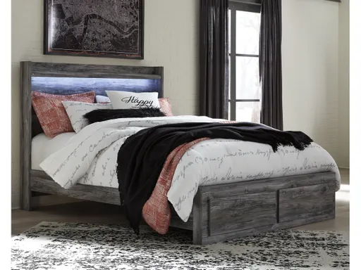 Rest in the casually cool style and practicality of the Baystorm queen panel storage bed. Its driftwood and smoky finish gives this bed an easy-going vibe that's perfect for creating a relaxed getaway in the room. Two underbed storage drawers provide ample room for stowing away spare bedding and more. Clean lines and modern charm blend for a fuss-free look. Included slats eliminate need for foundation/box spring. Mattress sold separately.