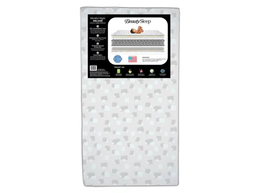 The Mindful Night Deluxe Two-Stage Crib and Toddler Mattress by BeautySleep offers comfort, support and durability all in one. Its innovative design features 160 supportive coils, a hypoallergenic waterproof cover made of vinyl, plus two distinct sleeping surfaces for infants and toddlers. The infant side of this mattresses features the ideal support for newborns while the toddler side features a layer of foam for comfort. All BeautySleep crib mattresses are GREENGUARD Gold Certified and meet the strictest standards offered by the GREENGUARD Environmental Institute, which recognizes products with low chemical emissions, contributing to improved indoor air quality.