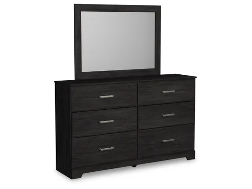 With its clean-lined look and modern attitude, the Belachime dresser and mirror is a fresh style awakening. A warm charcoal hue over replicated oak grain easily complements other furniture finishes. Smooth drawer fronts with antiqued pewter-tone handles complete the aesthetic.