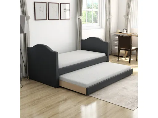 Simply and elegantly styled, this upholstered twin daybed with trundle is both cute and functional. Daybed is completely upholstered and slightly padded for a premium look and feel. The backless design opens up placement possibilities. Place it in front of a window to catch fresh dreams every night! The track-style side arms have a gentle sloping arch and are high enough to accept up to a 10” mattress with ease. Twin mattresses are not included with the daybed, so you can select the exact mattresses you prefer. Trundle drawer holds up to an 8” twin mattress and glides out on rollers with ease. Both mattress areas have supportive wood slats. Frame is constructed of durable MDF that provides a reliable structure to this cute and functional daybed. This daybed ships in 3 boxes, and comes complete with all the hardware needed, instructions and a 1 Year Limited Warranty.