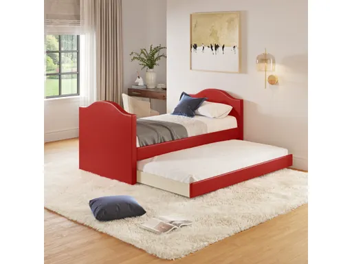 Simply and elegantly styled, this upholstered twin daybed with trundle is both cute and functional. Daybed is completely upholstered and slightly padded for a premium look and feel. The backless design opens up placement possibilities. Place it in front of a window to catch fresh dreams every night! The track-style side arms have a gentle sloping arch and are high enough to accept up to a 10” mattress with ease. Twin mattresses are not included with the daybed, so you can select the exact mattresses you prefer. Trundle drawer holds up to an 8” twin mattress and glides out on rollers with ease. Both mattress areas have supportive wood slats. Frame is constructed of durable MDF that provides a reliable structure to this cute and functional daybed. This daybed ships in 3 boxes, and comes complete with all the hardware needed, instructions and a 1 Year Limited Warranty.