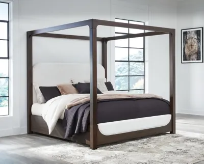 If casual contemporary style is your thing, then you'll love the Breckington queen upholstered canopy bed. Its sturdy silhouette with subtle curved elements lends a soothing sensibility from dusk to dawn. Next-Gen Nuvella™ fabric details pop with contrasting white alongside the dark brown wood-tone finish. Sleek and stylish, this bed is a fresh take on tranquility for the modern home.