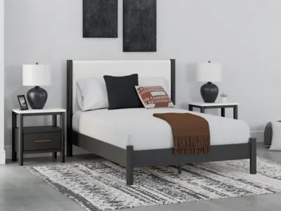 The Cadmori queen upholstered panel bed reflects your sophisticated approach to boho style. Crafted with both form and function in mind, its fresh white fabric beautifully contrasts the matte black finish. The versatile design suits all-neutral spaces or blends with your favorite pops of color. It’s inviting, yet posh. Luxe, yet laid-back. With this bed, your free-spirited vibe meets modern design.