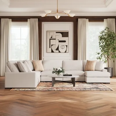A tailored approach to enduring comfort and versatility. The Calden sectional with chaise unites a sculptural silhouette with soft oyster white boucle to create the essence of quiet sophistication. It elevates your space while creating a genuinely inviting centerpiece for your home.