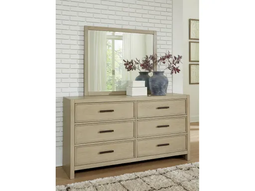 Satisfy your taste for calming, casually cool simplicity with the Calmoro dresser and mirror. More than easy on the eyes, its gray wash finish with warm undertones is highlighted with a white glaze to enhance the wood grain texture. Smooth-gliding storage drawers are accented with stylish metal bar pulls in a contrasting blackened steel finish. It's time to create the understated, relaxed look you want to wake up to every morning.