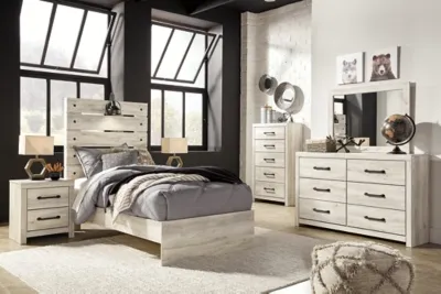 Whether you lean towards modern loft or modern farmhouse, the Cambeck panel bed, two nightstands, chest of drawers and dresser with mirror tip the balance in your favor. The wispy whitewash finish enhances the style without covering the grain for that weathered look you just can’t get enough of. Love to read in bed? You’re sure to find the retro-chic light sconce and USB plug-ins on the open-slat style headboard to be a totally bright idea, while the elongated metal drawer pulls really elevate the aesthetic. What a delightful take on rustic industrial style.