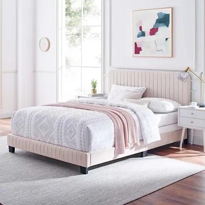 Elevate your master bedroom or guest bedroom style with the luxe texture and glam deco elegance of the Celine King Bed. Adorned with channel tufted detail, the king size headboard of this upholstered bed is padded in dense foam to offer supportive comfort while sitting up resting, relaxing, reading, or watching TV. Upholstered in stain-resistant performance velvet, this king size bed features support legs for added durability. A sturdy mattress foundation, this king size bed accommodates a variety of mattress styles including innerspring, memory foam and latex with the use of a box spring. Assembly required. Weight Limit: 900 pounds.