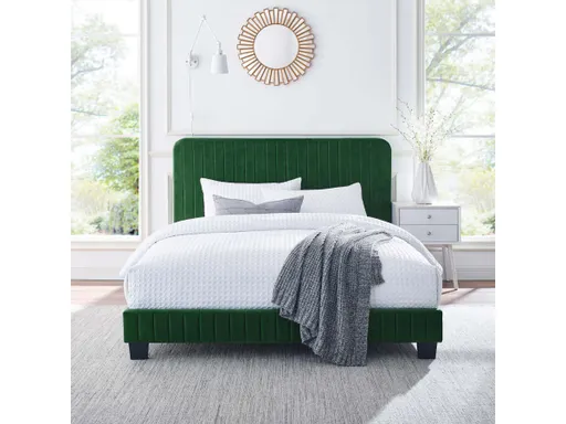 Elevate your master bedroom or guest bedroom style with the luxe texture and glam deco elegance of the Celine King Platform Bed. Adorned with channel tufted detail, the king size headboard of this upholstered bed is padded in dense foam to offer supportive comfort while sitting up resting, relaxing, reading, or watching TV. Upholstered in stain-resistant performance velvet, this platform bed eliminates the need for a box spring with a wood slat support system to allow for ample air circulation and a reinforced center beam and support legs for added durability. A sturdy mattress foundation, this king size platform bed accommodates a variety of mattress styles including innerspring, memory foam, and latex. Assembly required. Weight Limit: 800 lbs.