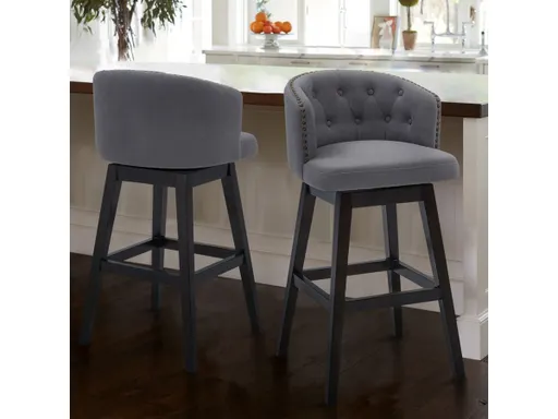 The Armen Living Celine wood barstool is an excellent choice for the transitional or contemporary household. Constructed from a combination of eucalyptus and birch wood frame that is certain to maintain its durability for many years to come. The Celine’s legs feature an Espresso wood finish and the plump, foam padded seat and back of the barstool are upholstered in grey fabric. The back of the Celine is rounded and features tufted accents that add a unique aesthetic accent to the piece. The barstool’s 360 degree swivel function allows for a wide range of movement while seated and the included footrest provides added comfort and support. The Celine’s legs are tipped with floor protectors, assuring that the barstool will not damage floors when moved. The Celine is sold in two industry standard sizes; 26 inch counter and 30 inch bar height. This wood barstool is available in gray or tan fabric.