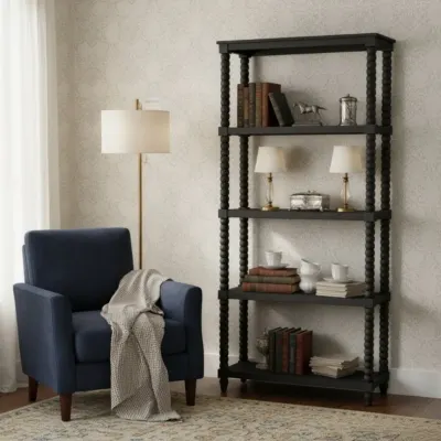 Elevate your decor with our 4-Shelf Etagere, a perfect blend of style and function. Painted in a sleek, smooth black finish, this mindi wood bookcase features elegantly turned beaded design shelf supports and legs, adding timeless charm to any room. The four open shelves offer ample space for display or storage, while adjustable levelers ensure stability on any surface. With easy assembly, just add the supports and legs. This piece will be an instant standout in your home!