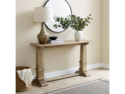 Add laid-back elegance to your entryway or living room with the Joanna Console Table. Combining a rustic finish with a classic farmhouse design, this stately console table adds style wherever it goes. The rectangular tabletop is enhanced by large pedestal columns with decorative trim on the trestle base. Ready to be used as a sofa table or a foyer drop-zone, the Joanna Console Table brings beauty to any room of your home.