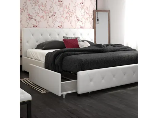 You’ll look forward to bedtime even more so now with the Atwater Living Dana Upholstered Bed with Storage. The Dana’s design is one that will instantly become the centerpiece of your bedroom. Upholstered in faux leather, this well crafted frame is accented with button tufted diamond detailing on both the headboard and footboard. The well designed bedframe features a bentwood slat support system that will allow you to sleep comfortably every night thanks to the even body weight distribution. Plus, the slats allow air to pass freely underneath you, keeping your mattress fresher for longer. The Dana also has metal side rails, center metal rail and additional metal legs that guarantee stability, support and durability. What’s more, the integrated storage drawers on casters allow for plenty of extra storage space. Make use of them by storing away your personal belongings like off-season clothing, bedding sets and more. Available in multiple colors and sizes. Ships in two easy to handle boxes and assembles quickly. This glamorous addition is just what you needed to complete the look of your bedroom.