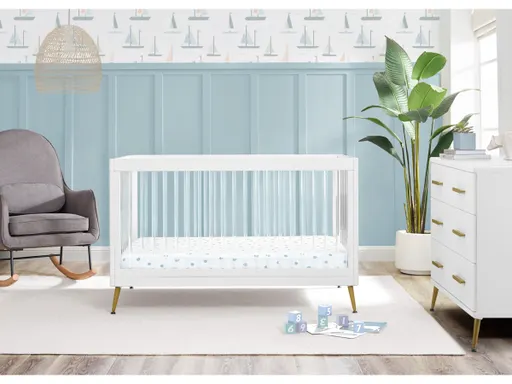 The Sloane 4-in-1 convertible crib is fashionable and functional, adjusting to your changing needs over time. In neutral colors that match just about any room decor, it transforms into a toddler bed, sofa and daybed as your child grows. Splayed bronze-tone feet add a polished look, and clear acrylic spindles create an open, airy feel. To complete the nursery, pair this crib with the Sloane 4-drawer dresser with changing top.