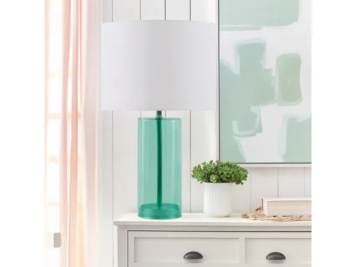 Infuse your space with personality with the 510 Design Neonova table lamp. Boasting a sleek glass body in a captivating blue hue, it's paired with a matching metal base and center rod for a cohesive look. The white drum-shaped shade adds a chic contrast while softly filtering light to emit a warm glow. Equipped with an on/off rotary switch and included LED bulb, it's as stylish as it is functional. Spot clean only. Illuminate your room with charm and flair using this delightful lamp!