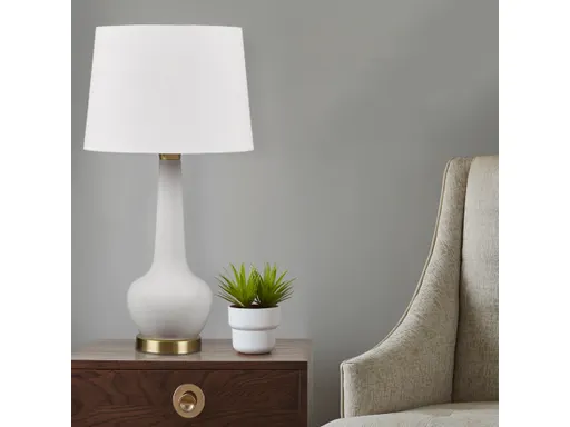 Radiate charm with the 510 Design Zazie Table Lamp. Its genie-style design, blending a refined ceramic base and a gold metal accent, embodies a seamless transitional style. The cream tapered drum shade emits a warm glow, adding sophistication and versatility. Featuring an on/off switch and a 60" cord, this plug-in lamp comes with a 9W LED bulb for instant ambiance. Its low-maintenance design ensures enduring elegance and a perfect addition for timeless allure in any space.