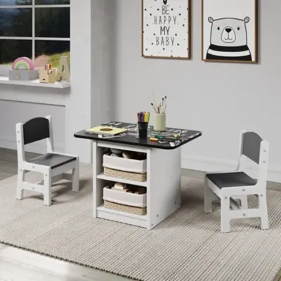 Introducing the Art & Play Black & White Chalkboard Table with Two Chairs Set! A versatile and engaging addition to any child's play space. As your little ones gather around the child-sized table, their eyes light up with excitement at the sight of the chalkboard tabletop, eager to unleash their creativity and explore the endless possibilities it offers. Whether they're doodling their latest masterpiece, practicing letters and numbers, or enjoying imaginative tea parties with friends, this set provides the perfect canvas for learning and play. Crafted from solid pine wood with a sleek black and white finish, it not only exudes modern elegance but also ensures durability and safety for your peace of mind. With its convenient storage cubby underneath, tidying up is a breeze, allowing for more time spent creating cherished memories and fostering your child's growth and development. Elevate playtime to new heights with this timeless investment in your child's happiness and creativity.