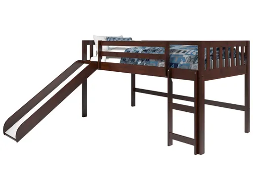 Create the bedroom of their dreams with this twin mission low loft bed with slide. Quality crafted of pine wood for sturdy construction made for years of enjoyment, this loft bed offers space-saving convenience, with an open space under the bed that's great for "camping in," play time, toy storage and more.