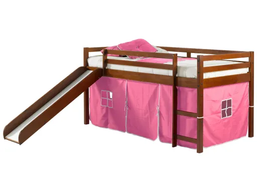Create the bedroom of their dreams with this twin low loft tent bed with slide. Quality crafted of pine wood for sturdy construction made for years of enjoyment, this loft tent bed offers space-saving convenience, with an open space under the bed that's great for "camping in," play time, toy storage and more.