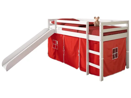 Create the bedroom of their dreams with this twin low loft tent bed with slide. Quality crafted of pine wood for sturdy construction made for years of enjoyment, this loft tent bed offers space-saving convenience, with an open space under the bed that's great for "camping in," play time, toy storage and more.
