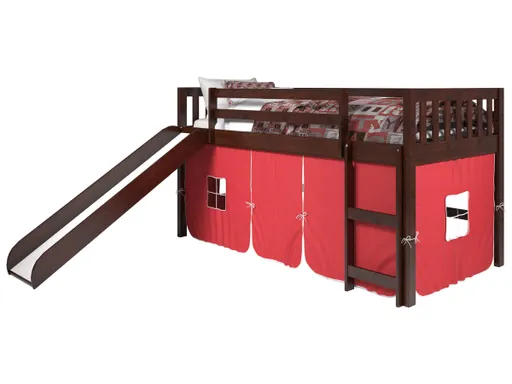 Create the bedroom of their dreams with this twin mission low loft tent bed with slide. Quality crafted of pine wood for sturdy construction made for years of enjoyment, this loft tent bed offers space-saving convenience, with an open space under the bed that's great for "camping in," play time, toy storage and more.