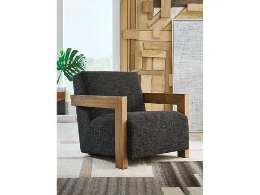 The Dorney accent chair’s air of authentic character is well-suited for your casual seating area. With its robust cushion covered in charcoal and brown boucle fabric, comfort and style go hand in hand. Angular wood arms, finished in a warm brown, provide a beautiful contrast to the softly curved seat.