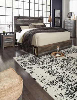 When merged in just the right way, rustic and industrial styles can make one happy marriage. Case in point: the Drystan king panel bed with storage. A refined take on barn board beauty, its complex, replicated wood grain showcases hints of burnt orange and teal tones for a sense of weatherworn authenticity. Love to read in bed? You’re sure to find the pair of retro-chic light sconces and USB plug-ins on the open-slat style headboard such a bright idea. Underneath the bed: smooth-gliding drawers and open cubbies that accommodate casually cool storage bins.