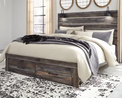 When merged in just the right way, rustic and industrial styles can make one happy marriage. Case in point: the Drystan king panel bed with storage. A refined take on barn board beauty, its complex, replicated wood grain showcases hints of burnt orange and teal tones for a sense of weatherworn authenticity. Double drawers at the foot of the bed come in mighty handy.