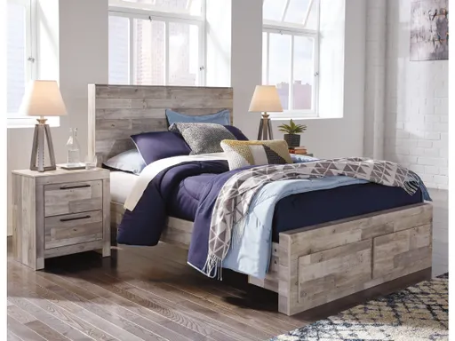 Butcher block has long been a staple in the kitchen, but the Effie full panel bed with storage transforms it into something fresh and new in the bedroom. A vintage whitewashed finish over replicated wood grain lends an urban farmhouse aesthetic to your restful retreat. Mattress available, sold separately.