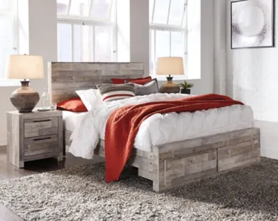 Butcher block has long been a staple in the kitchen, but the Effie queen panel bed with storage transforms it into something fresh and new in the bedroom. A vintage whitewashed finish over replicated wood grain lends an urban farmhouse aesthetic to your restful retreat. Mattress available, sold separately.