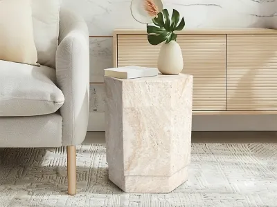 Elevate your decor with the Hexagonal Column Travertine Stone Finish Italian Design Side Accent Table, measuring 15"x15"x18", a versatile addition to both indoor and outdoor spaces. Crafted from durable MGO (Magnesium Oxide), this elegant piece is designed for long-lasting beauty and resilience. The travertine finish, inspired by traditional Italian design from the Tuscany region, masterfully replicates the appearance of authentic travertine marble with its smooth, large-grained, and textured stone-like surface. The table modern hexagonal shape introduces a unique geometric touch to your decor, making it a standout piece in any setting. With the capacity to support up to 220 pounds, it seamlessly combines both beauty and functionality. To preserve its pristine finish in outdoor environments, an annual application of a sealer coat is recommended, ensuring it remains a sophisticated focal point in any space.