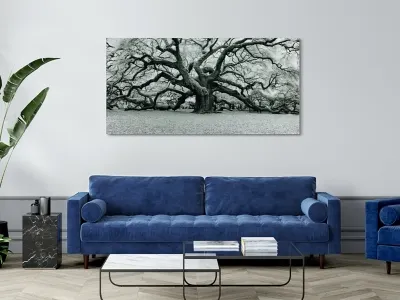 Ground your space with the wisdom and natural beauty of an ancient oak tree. The leaves and branches are life-giving and an encouraging component of this modern art piece. The black and white nature scape is a beautiful piece, sure to amplify any wall decor. This appealing printed art is sure to make a statement, measuring 36" x 72" x 0.2". Two pre-installed steel sawtooth hangers allow for seamless vertical hanging. This charming piece is part of our Frameless Free Floating Reverse Printed Tempered Art Glass collection.