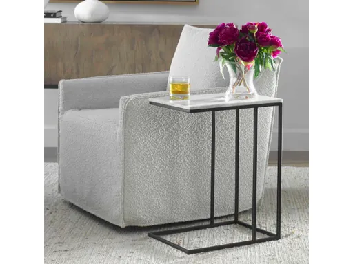 This perfectly sized accent table, with it's open design, will look great beside your favorite chair. The black metal frame is topped with a beautiful piece of white Morwad honed marble. Natural gray veining is throughout, making each piece a little bit unique.
