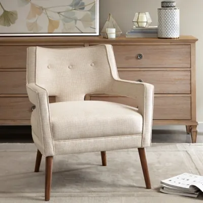 Update your space with the Madison Park Palmer Accent Chair. The open arm design and button tufted back creates a chic look fit for your living room. The beautiful cream upholstery features a small houndstooth pattern for extra charm and texture, while solid wood legs with a pecan finish add a rich appeal. Set this upholstered accent chair in your living room or entryway to complement your décor. Leg assembly is required.