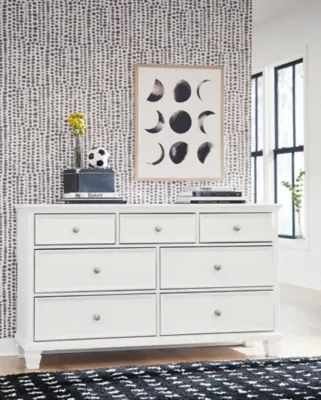 The Fortman dresser exudes timeless casual design that's ready to define your personal space. Its clean, contemporary white finish, framed drawer fronts and round metal knobs easily adapt to a variety of interiors. Featuring seven storage drawers with dovetail construction and traditional tapered feet, this piece is sure to bring elegant simplicity to your bedroom.