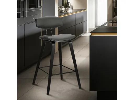 Sophisticated and versatile, the Fox counter height bar stool has a look that turns heads, and a mid-century design that is right at home in most any room decor. Its frame and legs feature a black brushed wood finish, while the gray faux leather seat is padded with high-density foam for comfort. The stool includes a metal footrest that provides added leg support and enhances the overall look.